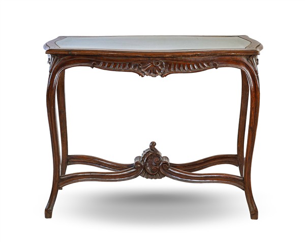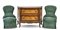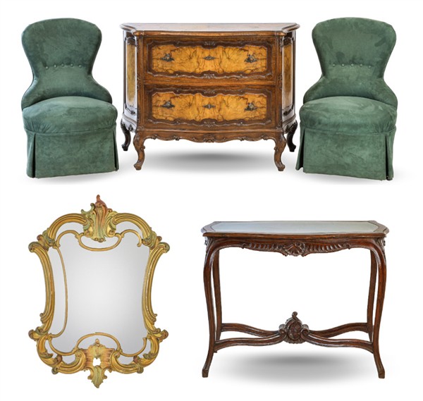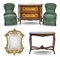 Lotto composto da un piccolo cassettone a due cassetti (cm 111x79x49), coppia di poltroncine da camera, un tavolino da centro con piano in vetro e una specchiera sagomata in legno verniciato (difetti)