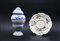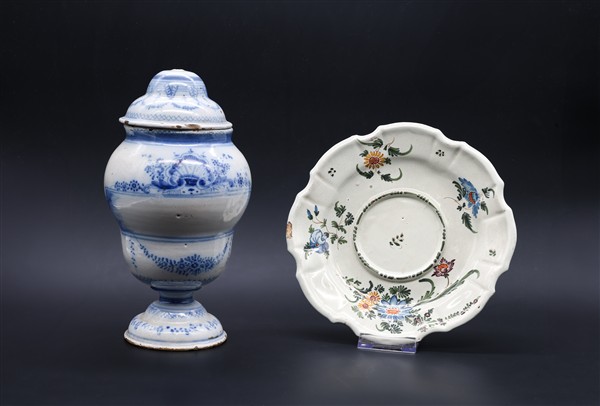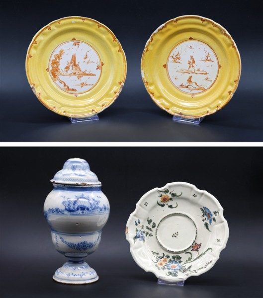 Manifatture diverse, secolo XVIII-XIX. Lotto composto da coppia di piatti in maiolica dipinta in monocromo arancio con figure e paesetti entro riserva su fondo giallo, Savona (d cm 22), un sottotazza da brodo mistilineo in maiolica con decoro a fiori (d cm 24) e un vaso da farmacia con coperchio in maiolica decorata in monocromo blu (h cm 27) (difetti e piccole mancanze)