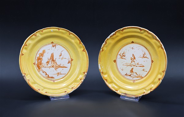 Manifatture diverse, secolo XVIII-XIX. Lotto composto da coppia di piatti in ma