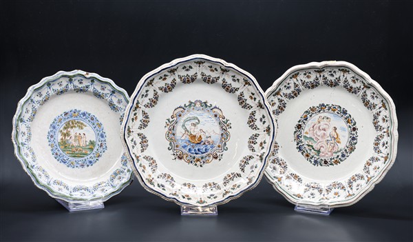 Manifattura di Moustiers, secolo XVIII. Lotto composto da tre piatti in maiolica dipinta in policromia con scene mitologiche entro riserva circolare nel cavetto con bordure floreali e a volute, tesa con festoni fioriti. Monogrammi al retro (d cm 26 e 23) (difetti)