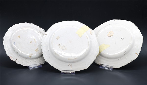 Manifattura di Moustiers, secolo XVIII. Lotto composto da tre piatti in maiolic