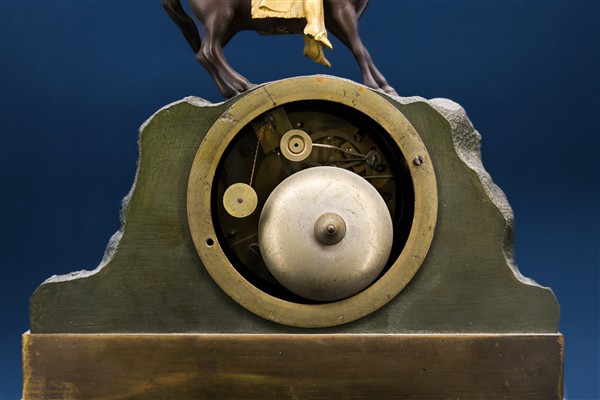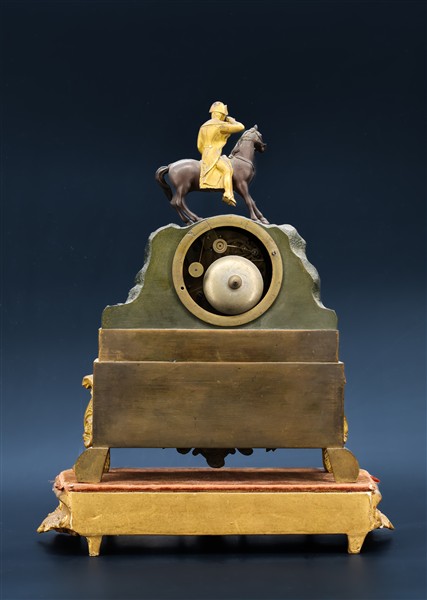 Pendola d'appoggio con cassa in bronzo dorato e patinato a soggetto marziale raffigurante Napoleone a cavallo. Quadrante argentato con finitura guilloché a cifre romane, movimento a due treni con suoneria delle ore e mezze su campanello. Francia, 1840 circa. Su base in legno dorato (h. tot cm 41) (difetti e mancanze)