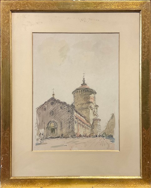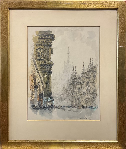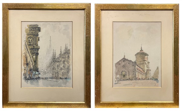 Lotto composto da due tecniche miste su carta raffiguranti veduta del Duomo di Milano e veduta di S. Maria delle Grazie, Milano (cm 42x32) firmate, una datata 1956