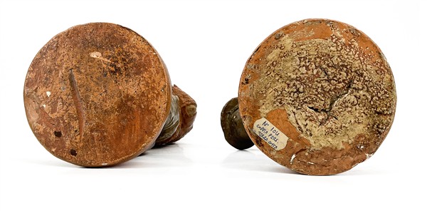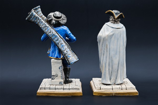 Manifatture diverse, secolo XIX-XX. Lotto composto da coppia di figure di fanciulli mendicanti in terracotta policroma (h cm 32) e coppia di figure di venditori ambulanti in porcellana policroma (h cm 25) (difetti e piccole mancanze)