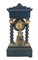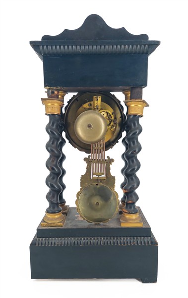 Pendola a portico con cassa in legno ebanizzato e decorato a intarsi. Quadrante in smalto bianco a numeri romani, movimento a due treni con suoneria delle ore e mezze su campanello. Francia, metà del secolo XIX (h. cm 49) (difetti)