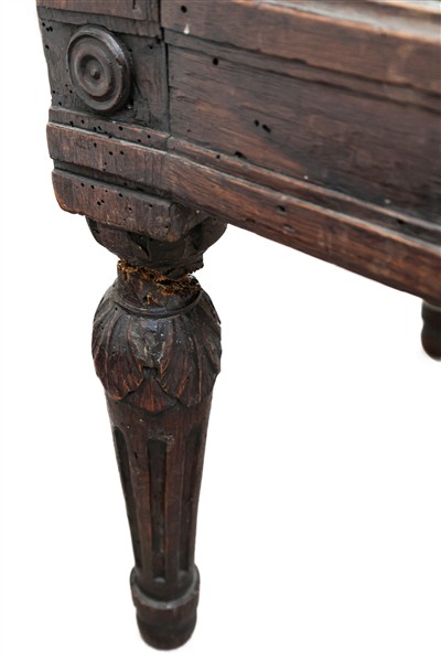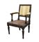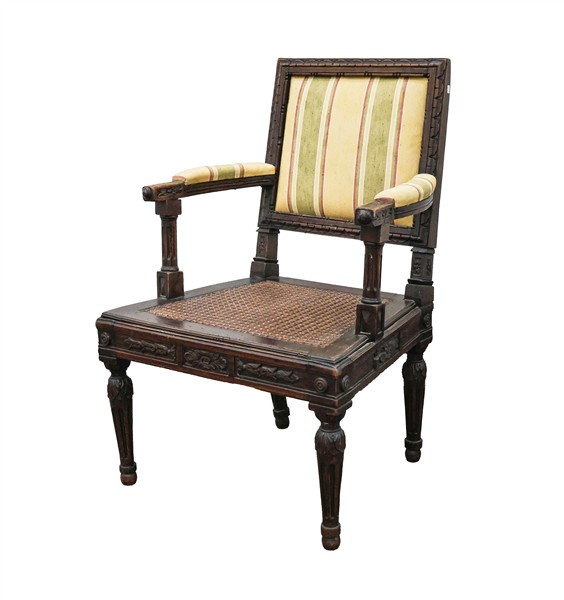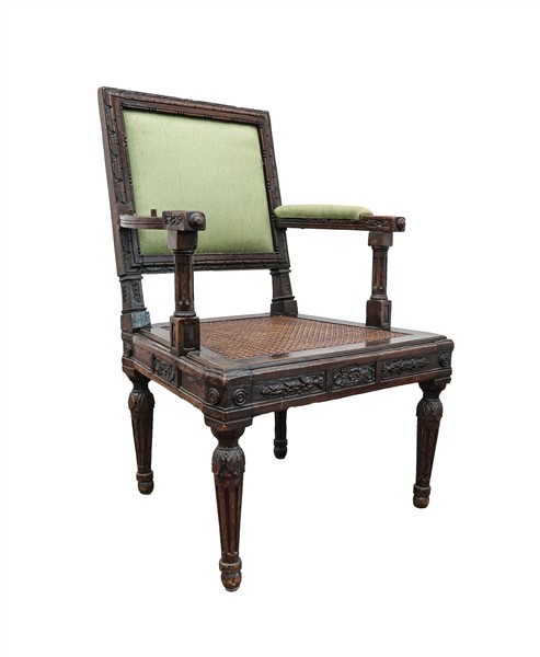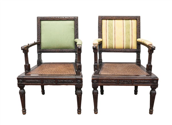 Coppia di poltrone in noce con profili, braccioli e fascia intagliati a motivi vegetali, montanti e gambe scanalate, sedute incannucciate. Secolo XVIII (difetti e mancanze)