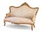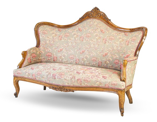 Divano a tre posti di forma mossa in noce intagliato, rivestimento in tessuto floreale. Secolo XIX (cm 160x114x70) (difetti)