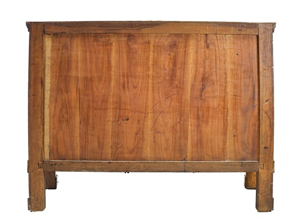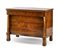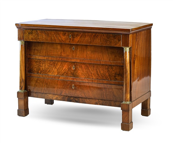 Cassettone lastronato in noce e radica, fronte a quattro cassetti con montanti a colonna su piedi a plinto, capitelli in bronzo. Secolo XIX (cm 119x91x59) (difetti)