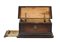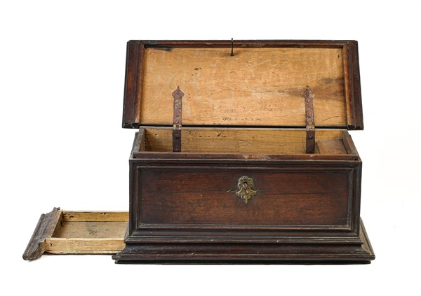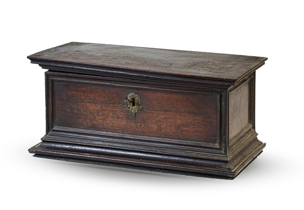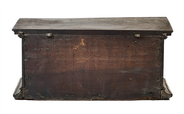 Modello di cassapanca in legni vari con piano ribaltabile, fronte e fianchi pannellati e tiretto laterale. Secolo XVIII (cm 53x25x25) (difetti)
