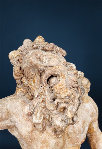 Scultura in terracotta dipinto a forma di figura barbuta seduta e reggente bambino (h cm 56,5) (difetti e mancanze)