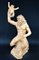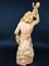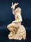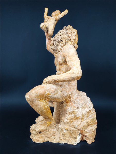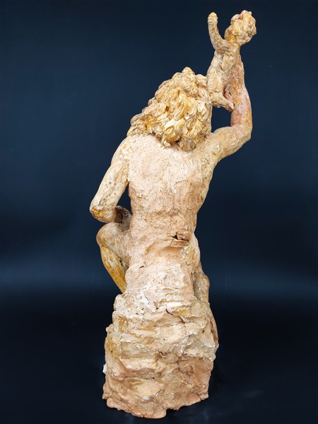 Scultura in gesso dipinto a forma di figura barbuta seduta e reggente bambino (