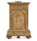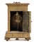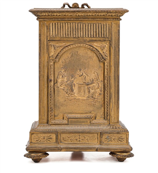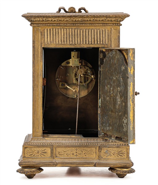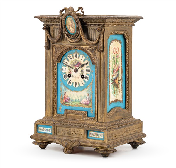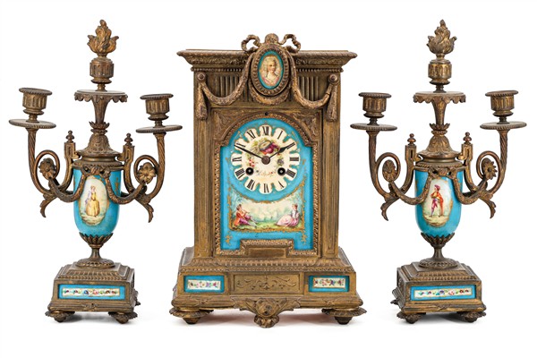 Trittico da camino composto da una coppia di candelabri a tre fiamme e una pendola in metallo dorato con placche in alabastro dipinte in policromia con temi allegorici e galanti. Quadrante a finte cartouches a numeri romani, movimento a due treni con suonerie delle ore e mezze su campanello mancante. Francia, seconda metà del secolo XIX (h. max cm 36) (difetti e mancanze)