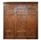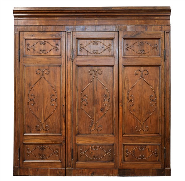 Fronte di armadiatura a muro a tre ante pannellate in noce con decorazione a volute contrapposte (cm 224x72 cad.) in cornice con cappello aggettante (cm tot 244x252) (difetti e restauri)