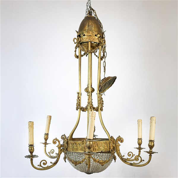 Lampadario a sei luci in metallo dorato con bracci a voluta e raccordi festonati, calotta centrale decorata da catenelle di vetri sfaccettati (h cm 98, d cm 81) (difetti e restauro)