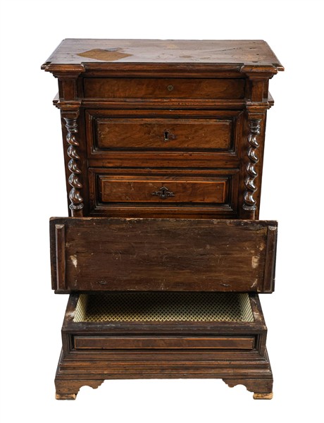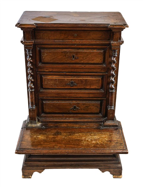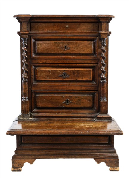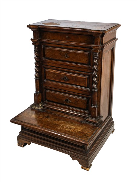Inginocchiatoio in noce a tre cassetti pannellati sul fronte e tiretto sottopiano, montanti a colonna tortile, predellino ribaltabile e piedi a mensola. Secolo XVII (cm 65x93x61) (difetti e sostituzioni)