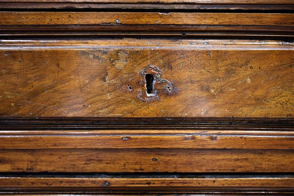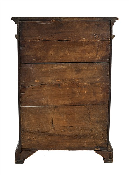 Inginocchiatoio in noce a tre cassetti pannellati sul fronte e tiretto sottopia