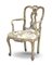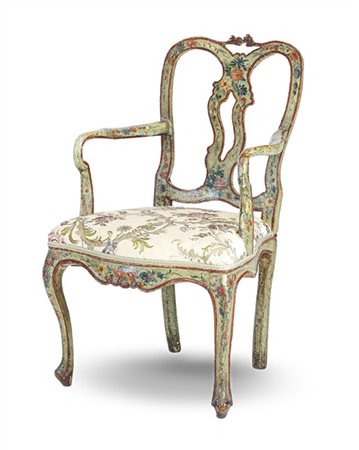 Poltrona in legno dipinto e laccato con decori floreali in policromia e profili in rosso, schienale a giorno con cartella sagomata e traforata, gambe anteriori mosse. Veneto, secolo XVIII (difetti e restauri)