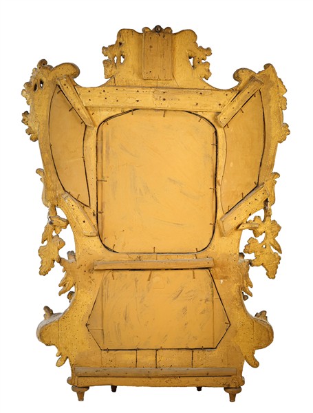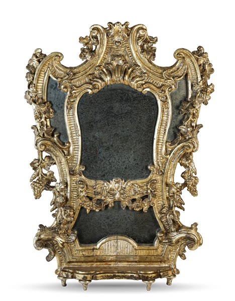 Altarolo d'appoggio in legno intagliato e dorato a mecca, mensola alla base e decoro a volute e racemi fogliati fioriti e grappoli d'uva, inserti sagomati a specchio. Napoli, secolo XVIII (cm 111x78) (difetti e piccolo restauro)