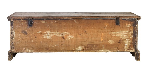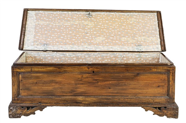 Cassapanca in legno con fronte riquadrato, piedi a mensola sagomati a motivi st