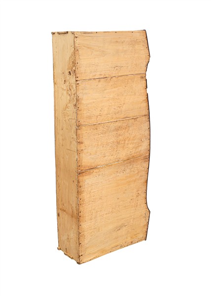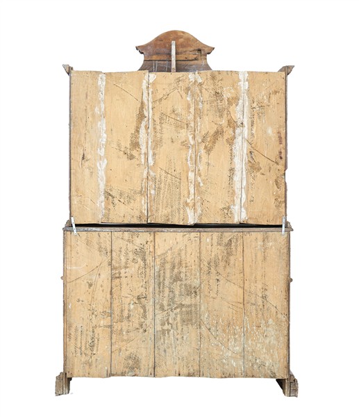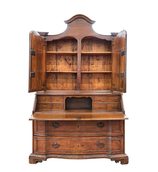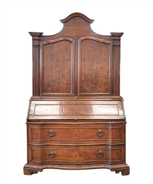 Trumeau in noce con parte inferiore mossa a due cassetti, piedi a mensola e calatoia celante otto tiretti e vano a giorno, parte superiore a due sportelli sagomati e cimasa a linea spezzata. Secolo XVIII (cm 160x252x63) (difetti e restauri)