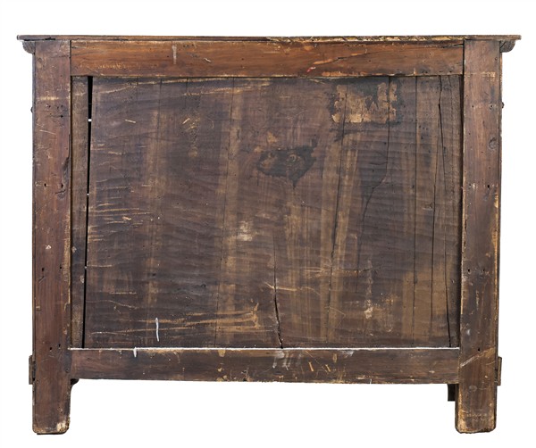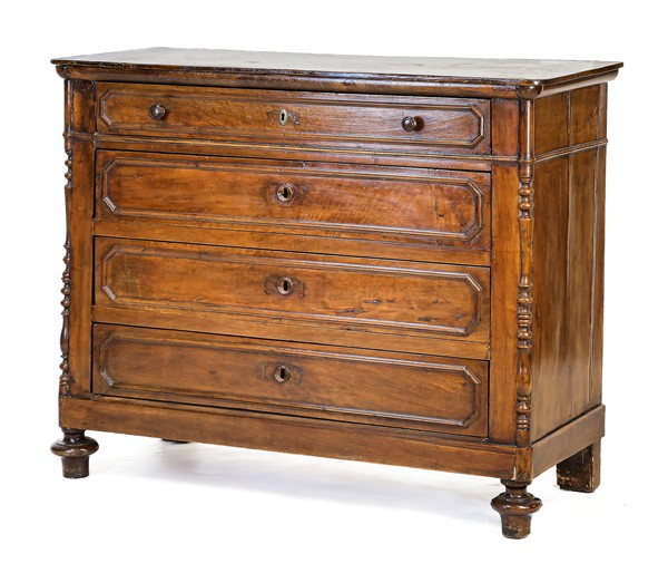 Cassettone di noce con fronte a quattro cassetti e montanti parzialmente tornit