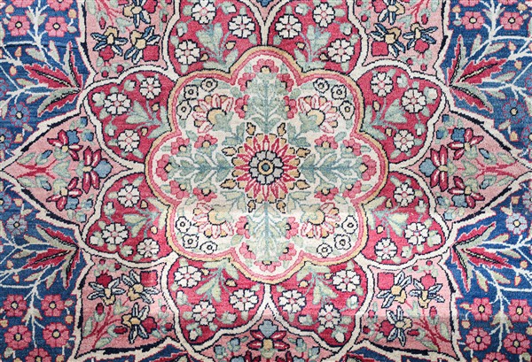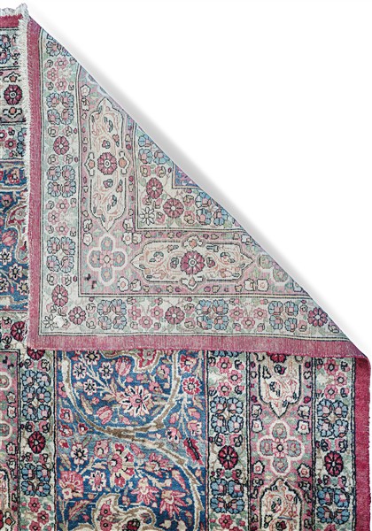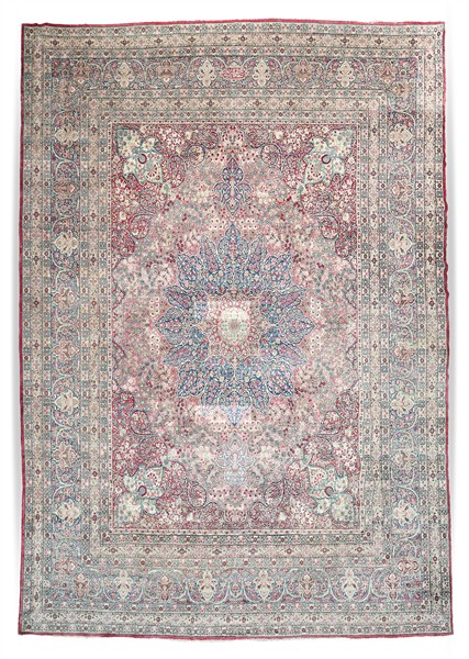 Tappeto Kirman Laver, Persia, fine secolo XIX. Decoro con grande medaglione nei toni del ciclamino, azzurro e rosa su campo bianco. Importanti angolari a fondo ciclamino con rami fioriti somiglianti ai piumaggi della corona dello Scià. Molteplici bordure, la principale di grandi dimensioni con andamento a meandro presenta un cartiglio in lingua persiona con scritta in bianco su fondo ciclamino (cm 655x533) (difetti e rapature)