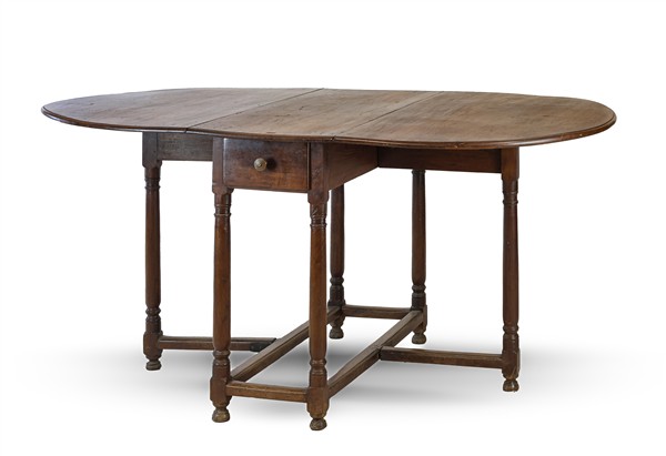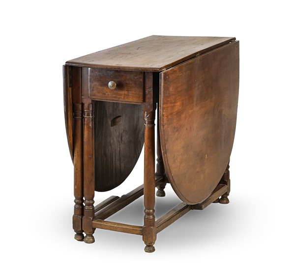 Tavolo a bandelle in noce con piano ovale e cassetto sul lato corto, gambe tornite riunite da traverse. Stampigliatura a fuoco (chiuso cm 97x79x45, piano aperto cm 170x97) (difetti)