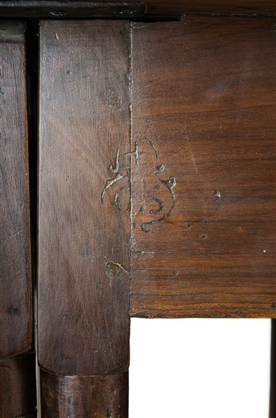 Tavolo a bandelle in noce con piano ovale e cassetto sul lato corto, gambe torn