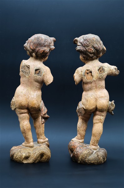 Scultore di inizio secolo XVIII, coppia di angeli in legno intagliato, laccato e dorato (h cm 44) (restauri e mancanze)