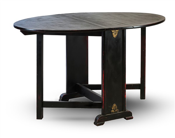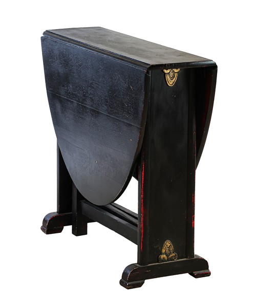 Tavolino a bandelle in legno ebanizzato con sostegni geometrici e decorazioni dorate a rilievo sui fianchi. Inizio secolo XX (aperto cm 82X75x127) (difetti)