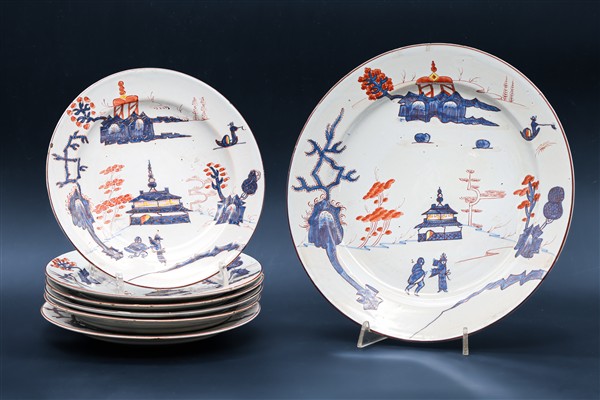 Manifattura di Felice Clerici o Pasquale Rubati, Milano, secolo XVIII. Lotto composto da sei piatti e un piatto grande in maiolica dipinta in policromia con con decoro "alla pagoda o "al carabiniere" (d cm 23 e 30,5) (difetti)
