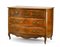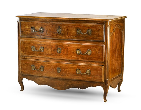 Cassettone in noce filettato con fronte mosso a tre cassetti e grembiale sagomato, piedi a voluta. Secolo XVIII (cm 131x99x66) (difetti)