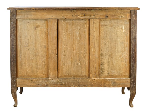 Cassettone in noce filettato con fronte mosso a tre cassetti e grembiale sagoma