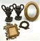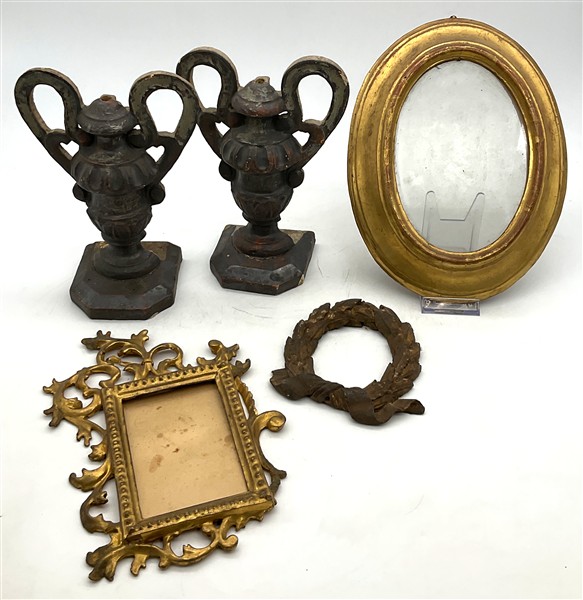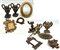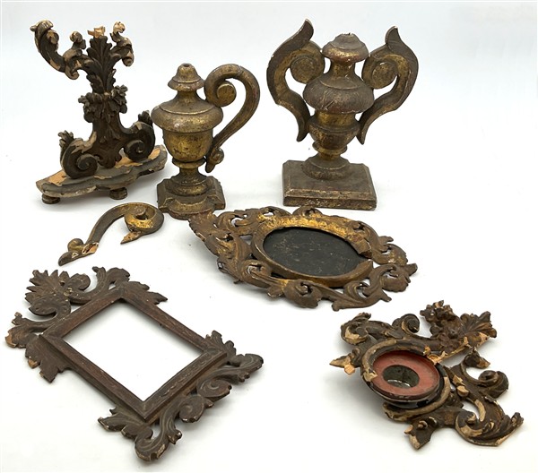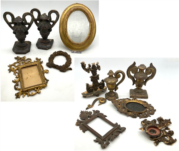 Due cartoni contenenti diversi portapalme in legno e altri materiali e fregi di differente epoca e decoro (difetti e rotture)