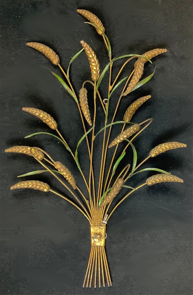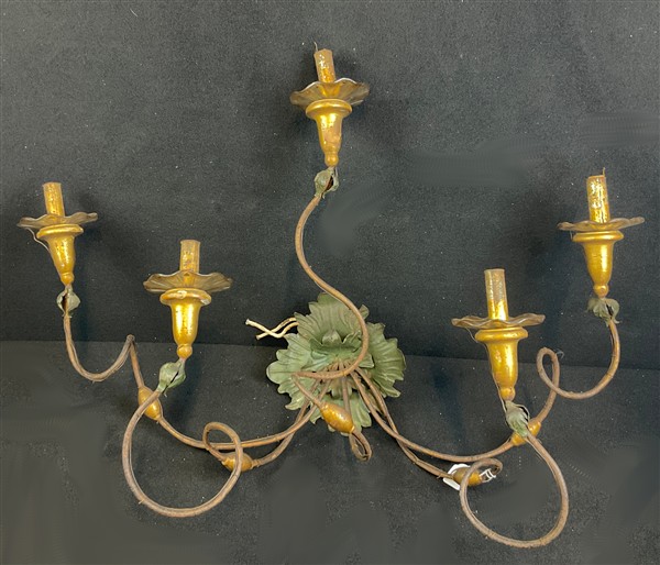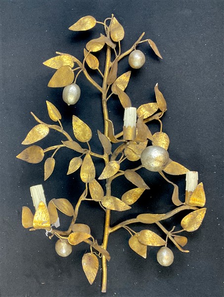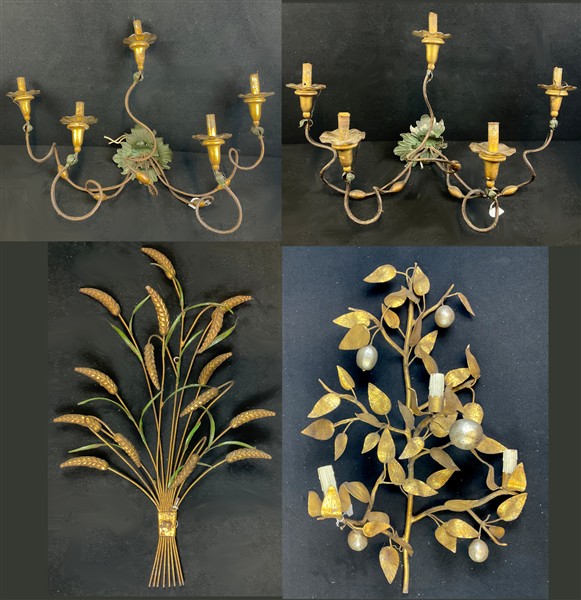 Lotto composto da quattro diverse applique in metallo e lamierino dorato e dipinto, alcune con racemi fogliati e frutti (h max cm 75) (difetti e mancanze)