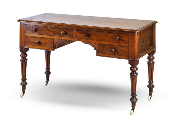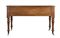 Scrivania da parete in noce con fronte a quattro cassetti, gambe tornite e scanalate con piedi su ruotine. Fine secolo XIX (cm 122x72,5x52) (difetti)