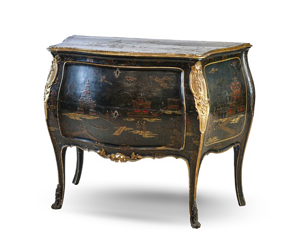 Comò bombato a due cassetti in legno laccato e dipinto in policromia a paesaggi orientali con figure e pagode, profili intagliati e dorati, gambe mosse (cm 104x87x51) (difetti)