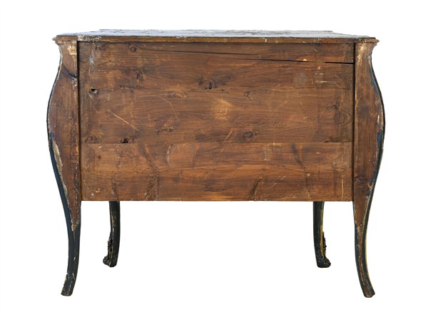 Comò bombato a due cassetti in legno laccato e dipinto in policromia a paesaggi