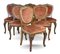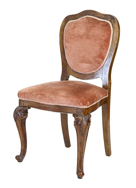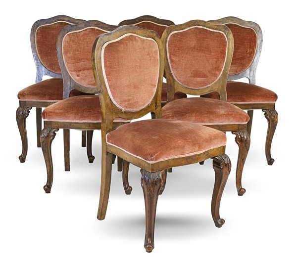 Gruppo di sei sedie in noce con gambe anteriori mosse e schienale sagomato, rivestimenti in velluto (difetti)