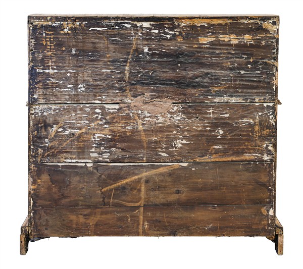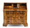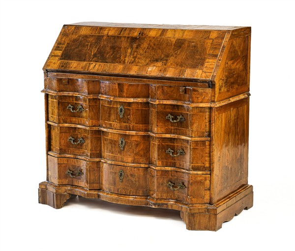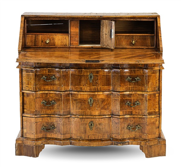 Ribalta lastronata in noce e radica di noce con filettature, fronte mosso a tre cassetti e calatoia celante due tiretti, antina e pianetto scorrevole che rivela tiretti interni. Secolo XVIIII (cm 102x101x56) (difetti, restauri e mancanze)