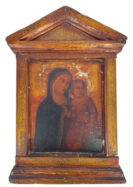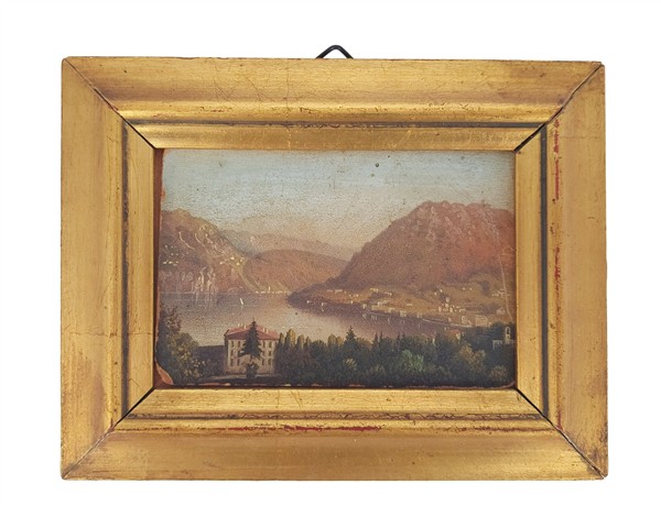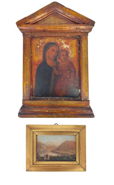 Ignoto, lotto composto da un dipinto raffigurante Madonna con Bambino, tecnica mista su tavola in cornice con timpano (cm totali 50x33) e un piccolo paesaggio lacustre ad olio su cartoncino (cm 6,5x10) (difetti)
