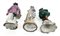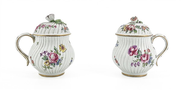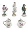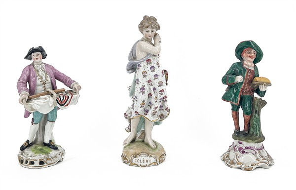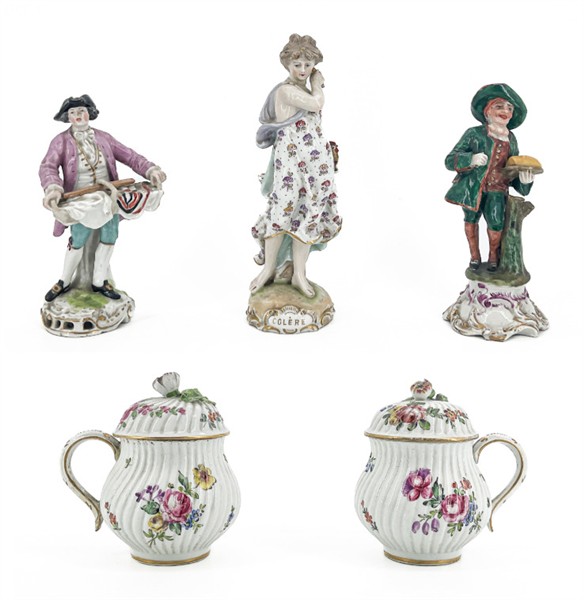 Manifatture diverse, secolo XIX-XX. Lotto composto da due figurette di venditori ambulanti in porcellana policroma, una figura allegorica della Collera e coppia di cremiere con coperchio in porcellana baccellata ad un'ansa (h max cm 19) (difetti e piccoli restauri)