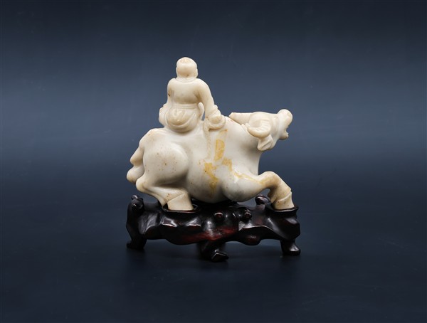 Intaglio in pietra saponaria raffigurante bambino sul dorso di un ariete Cina,