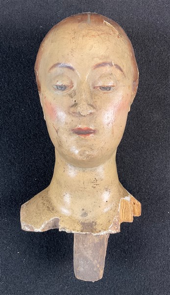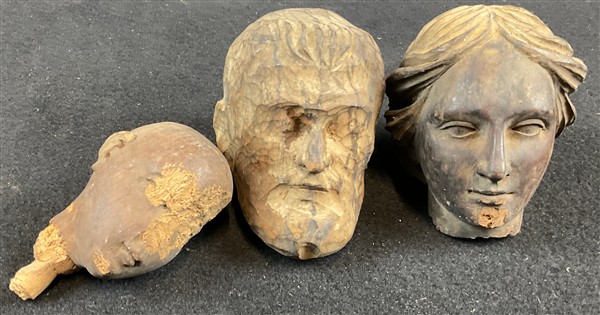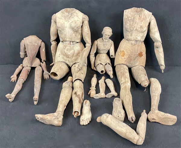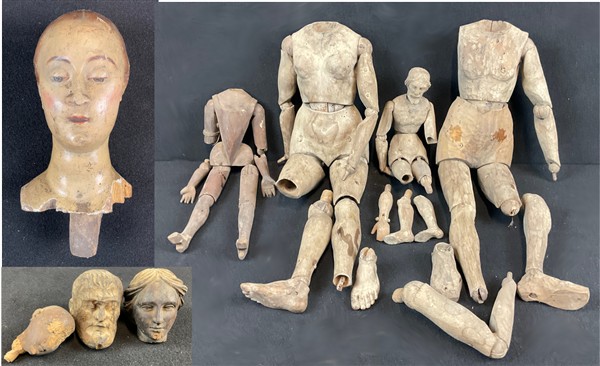 Cartone contenente diversi antichi manichini e testa di materiali e misure diverse (difetti e rotture)