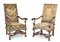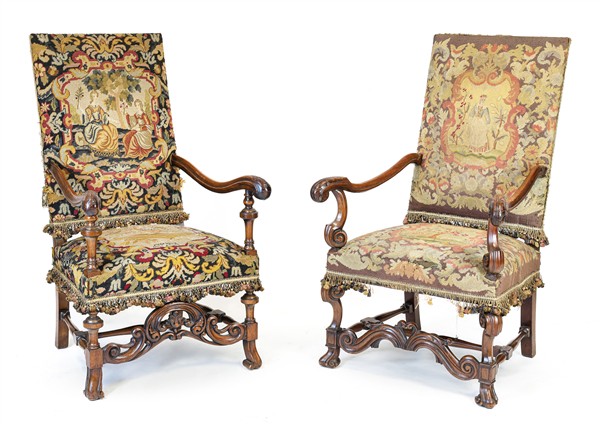 Due antichi seggioloni in legno intagliato con braccioli mossi e fronte con traversa a volute, sedute e schienali rivestiti in tessuto a piccolo punto con figure e paesaggio (cm max 72x122x71) (difetti)