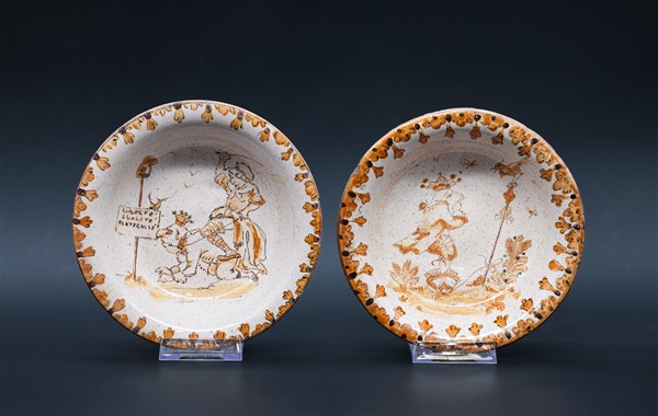 Manifattura francese, secolo XVIII-XIX. Quattro ciotole in maiolica dipinta in monocromo con figure caricaturali della rivoluzione e allegoriche nel cavetto, bordure con motivi stilizzati (d max cm 18) (difetti)
