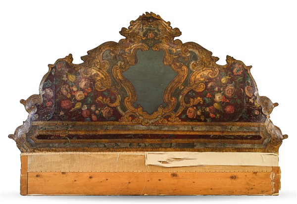 Testiera da letto di forma sagomata in legno rivestito in cuoio impresso e dipinto a fiori in policromia e volute dorate. Secolo XVIII (cm 197x130) (difetti, restauri e adattamenti)