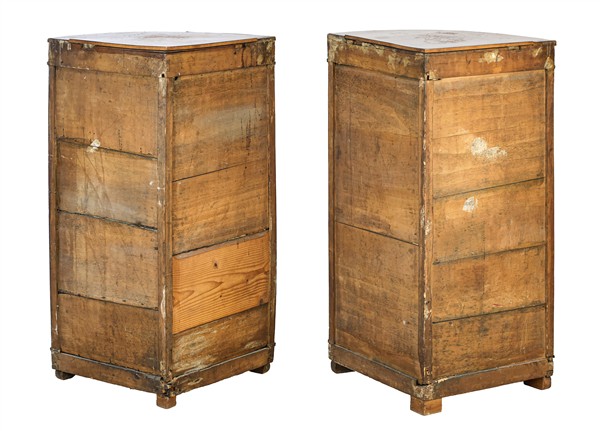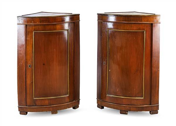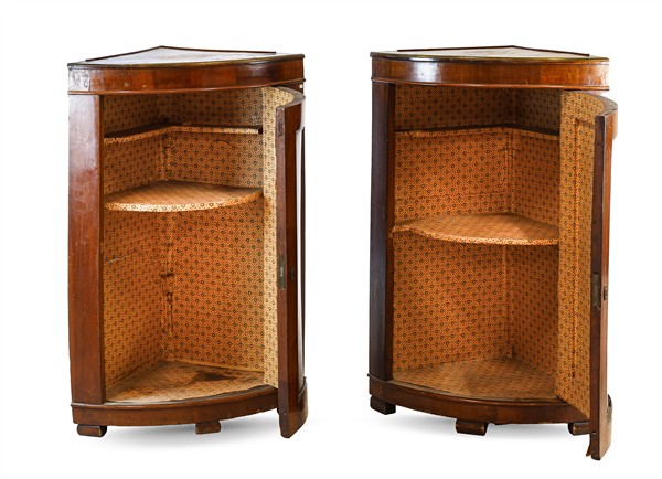 Coppia di cantonali ad un'anta pannellata con filettature in metallo. Secolo XIX (cm 64x97x44) (difetti)
