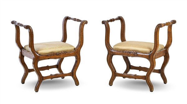 Coppia di panchetti in noce di forma mossa con braccioli torniti e sedute imbot