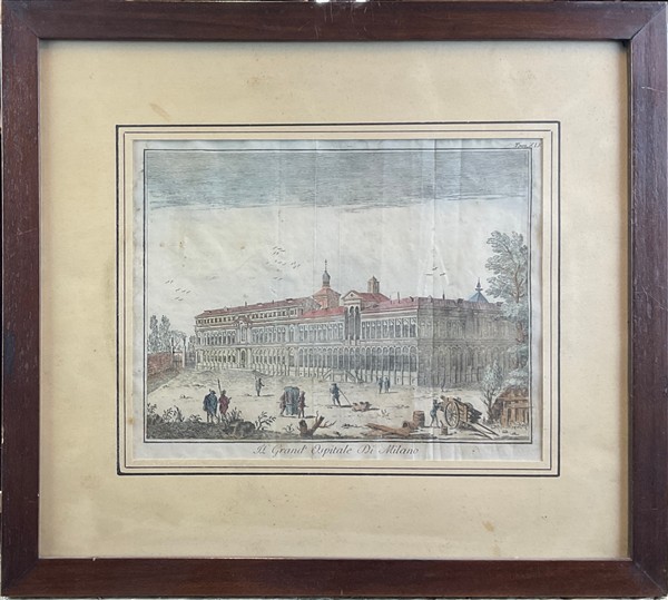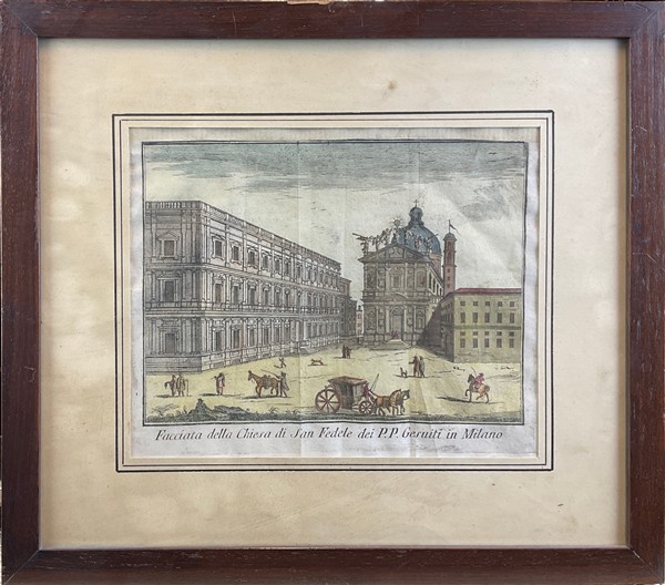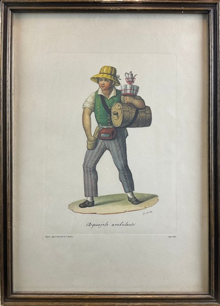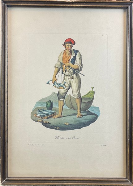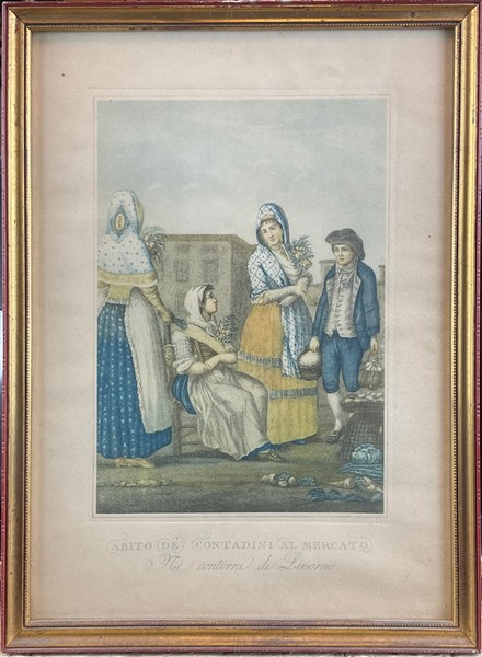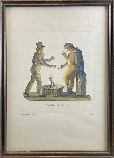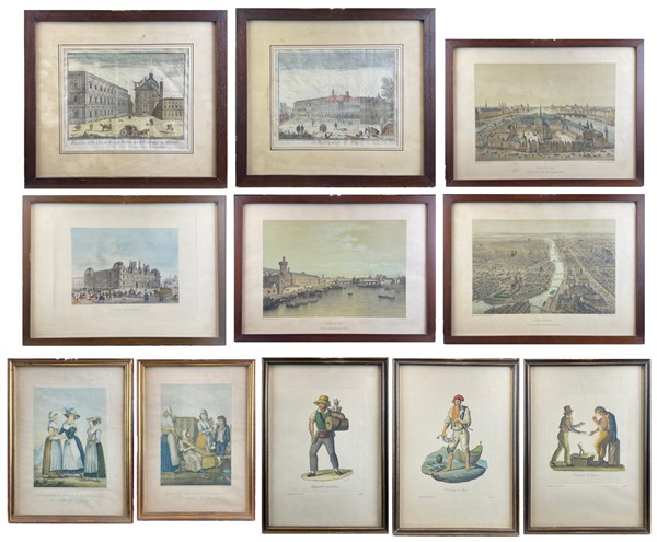 Cartone contenente diciotto tra stampe e riproduzioni a colori raffiguranti costumi e scorci urbani, in cornici (difetti)